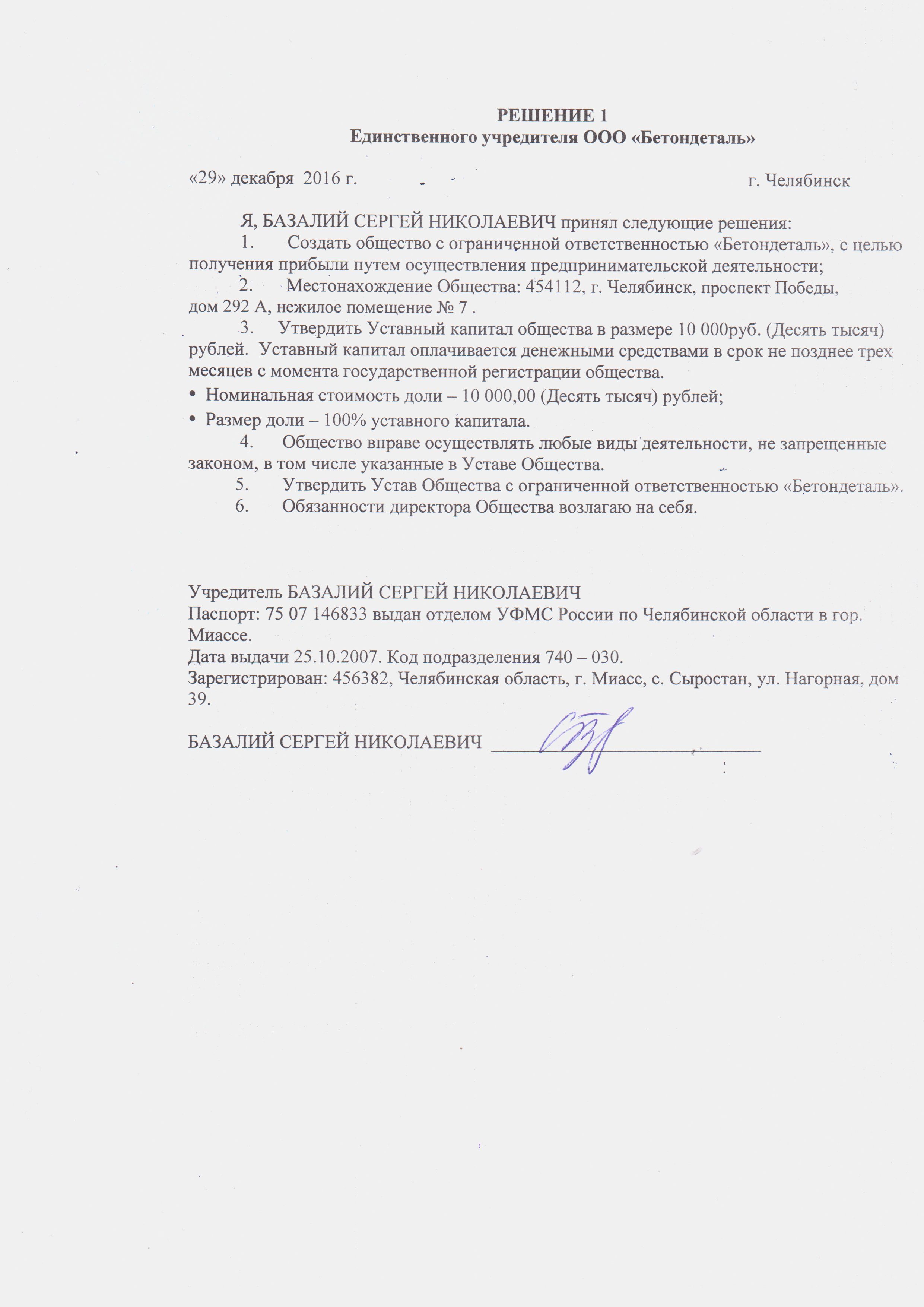 Решение учредителя о создании компании